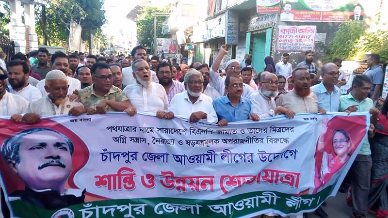উন্নয়ন শোভাযাত্রার পূর্বে শান্তি সমাবেশে ভার্চুয়ালি প্রধান অতিথির বক্তব্যে জেলা আওয়ামী লীগের সাধারণ সম্পাদক বীর মুক্তিযোদ্ধা আবু নঈম দুলাল পাটওয়ারী রাখেন। তিনি তার বক্তব্যে বলেন, বঙ্গবন্ধুর সোনার বাংলা গড়তে তাঁরই সুযোগ্য কন্যা গণতন্ত্রের মানসকন্যা প্রধানমন্ত্রী শেখ হাসিনার নেতৃত্বে দেশ এগিয়ে যাচ্ছে। বয়স্ক ভাতা, বিধবা ভাতা, শারীরিক অসুস্থতার জন্য চিকিৎসা ও অস্বচ্ছল ব্যক্তিদের অনুদান, অসহায় মানুষ বাসস্থানের জন্য ঘর, জমি পাচ্ছে। শিক্ষার্থীর শিক্ষাবৃত্তি পাচ্ছে। রাস্তা- ঘাটের উন্নয়ন, কালভার্টসহ দেশের বিভিন্ন জেলার যান চলাচলের যোগাযোগ ব্যবস্থা, নতুন নতুন রেললাইন ও শহরের যানযট নিরসনে মেট্রোরেল চালু করা হয়েছে। কিন্তু পদযাত্রা নামে বিএনপি-জামাত ও তাদের দোসররা শেখ হাসিনার সরকারের উন্নয়নকে নসাৎ করতে, দেশে নৈরাজ্য সৃষ্টি করতে রাস্তা নেমেছে। তাই উন্নয়নের ধারা অব্যাহত রাখতে আমরা ঐক্যবদ্ধ হয়ে আমরা চাঁদপুরের মানুষকে সাথে নিয়ে এর প্রতিরোধ করতে হবে।