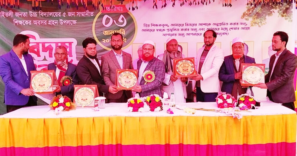চাঁদপুরের মতলব দক্ষিণ উপজেলার ধলাইতলী জনতা উচ্চ বিদ্যালয়ের অবসরপ্রাপ্ত পাঁচ শিক্ষককে বর্ণাঢ্য বিদায় সংবর্ধনা দিল বিদ্যালয়ের সাবেক ও বর্তমান শিক্ষার্থীরা। শনিবার সকালে বিদ্যালয় মাঠে আয়োজিত বিদায় সংবর্ধনা অনুষ্ঠানে শুভেচ্ছা বক্তব্য রাখেন বিদ্যালয়ের প্রধান শিক্ষক মো. মিজানুর রহমান।