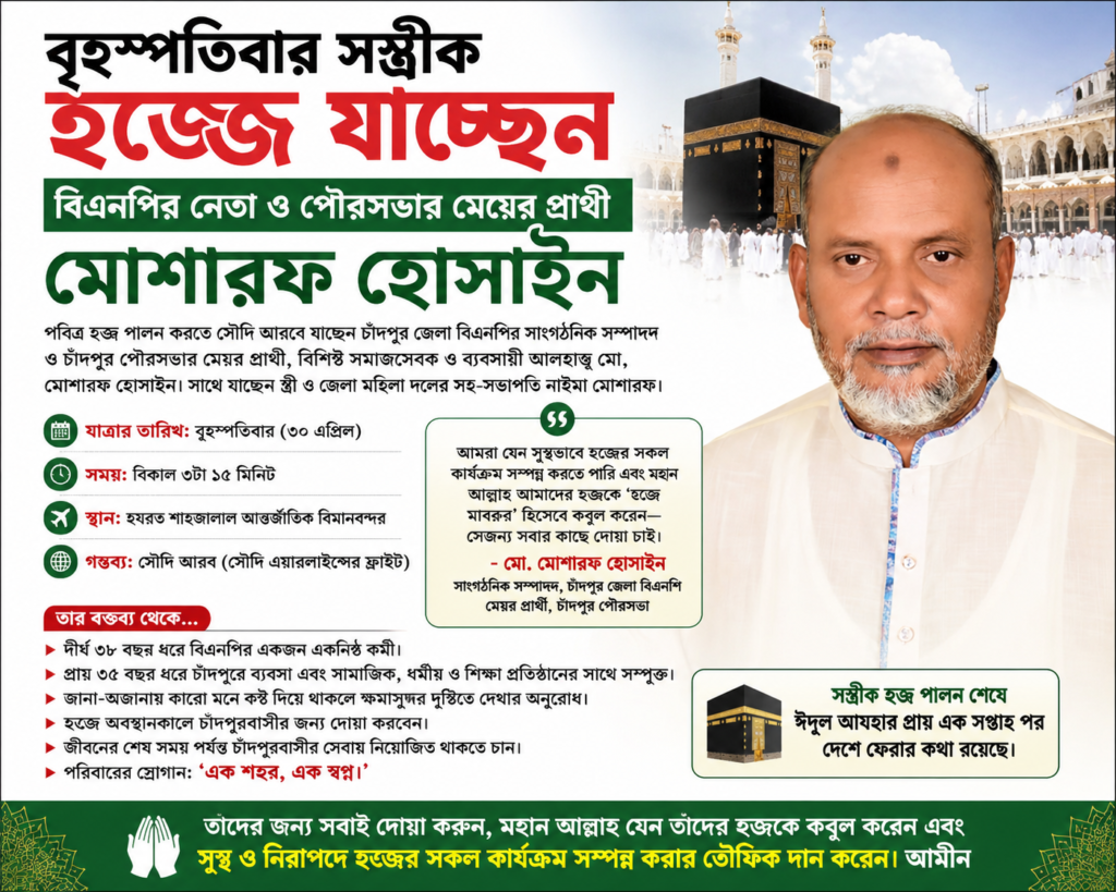 পবিত্র হজ পালনের উদ্দেশ্যে সস্ত্রীক সৌদি আরব যাচ্ছেন চাঁদপুর জেলা বিএনপির সাংগঠনিক সম্পাদক ও চাঁদপুর পৌরসভার মেয়র প্রার্থী, বিশিষ্ট সমাজসেবক ও ব্যবসায়ী আলহাজ্ব মো. মোশারফ হোসাইন। তাঁর সঙ্গে যাচ্ছেন স্ত্রী, জেলা মহিলা দলের সহ-সভাপতি নাইমা মোশারফ।